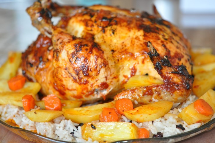 İstediğiniz şekilde doğradığınız patates ve havucun üzerine 2 yemek kaşığı sıvıyağ gezdirin. Tavuğun yanına serpiştirip tepsinizi tekrardan fırına vererek tavuğun üzeri kızarana kadar pişirin.