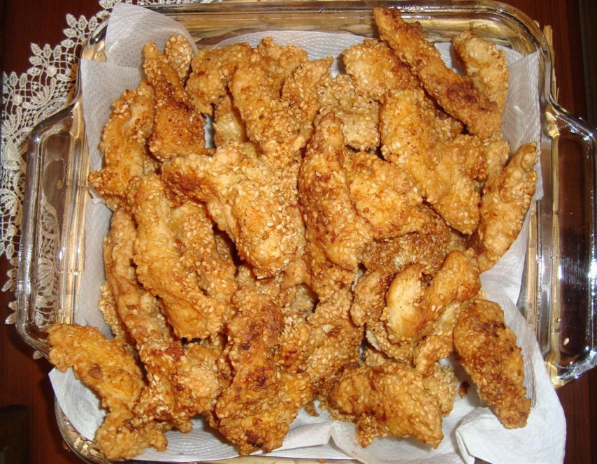 Parmak şeklindeki tavuklar önce una sonra iyice çırpılmış yumurtaya sonra susama batırılır.