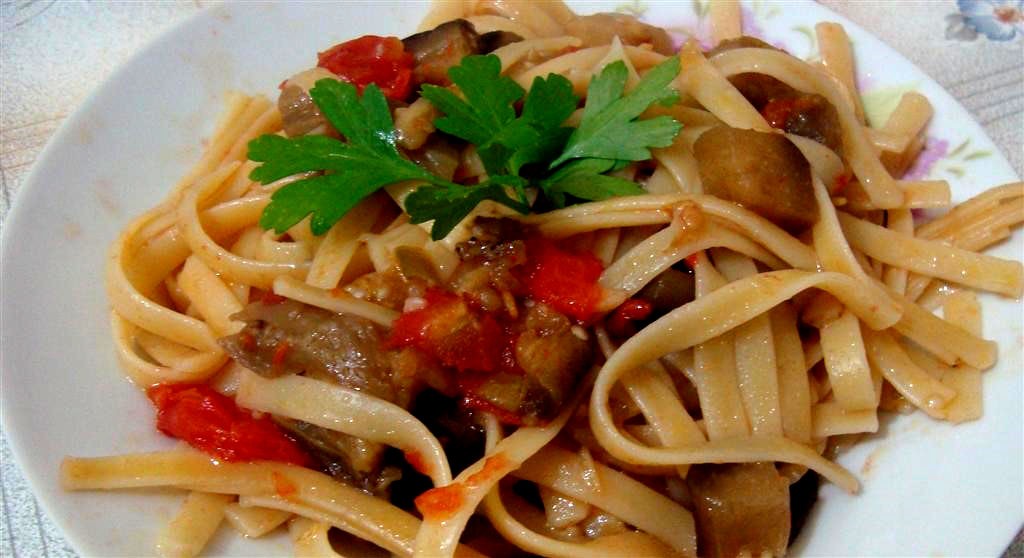 Yıkanıp kurulanan patlıcanlar da tavaya ilave edilir 5-6 dk pişirildikten sonra küp şeklinde doğranmış domatesler tavaya katılır karıştırılır