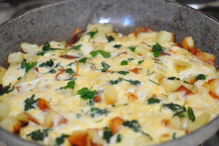 Pişen patateslere yumurtalı karışım ilave edilir tavanın kapağı kapatılıp altı kısılır.