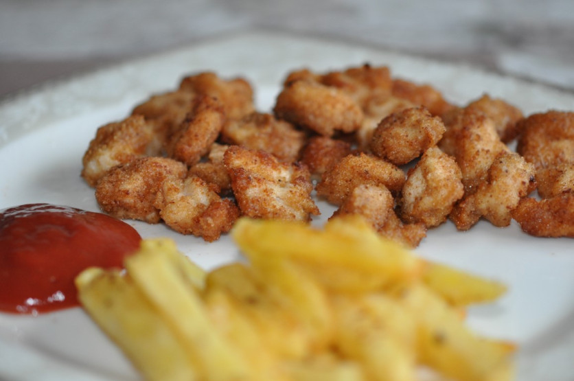 İnce şeritler halinde kesilmiş tavuk göğsü ve kanat önce unlu karışıma daha sonra mısır gevreğine bulanır.