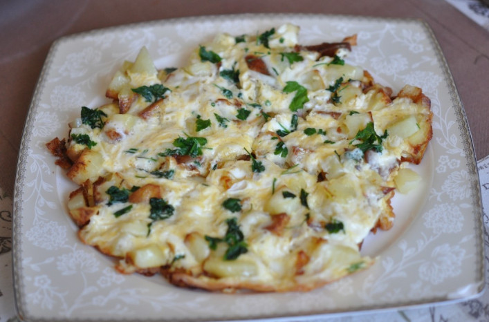 Pişen patateslere yumurtalı karışım ilave edilir tavanın kapağı kapatılıp altı kısılır.