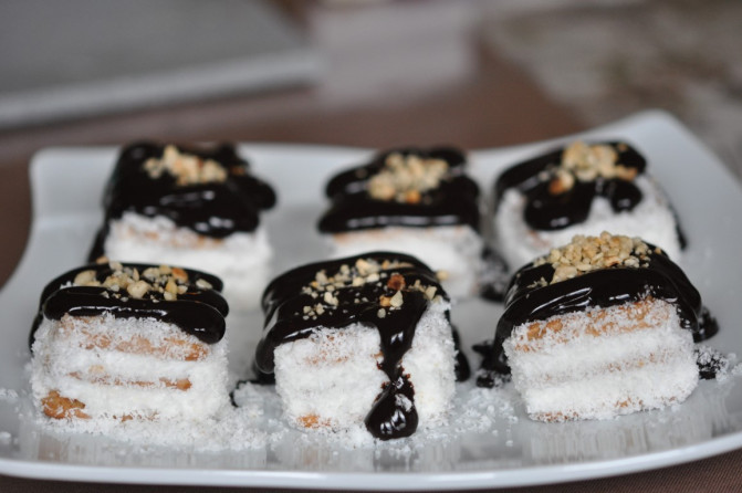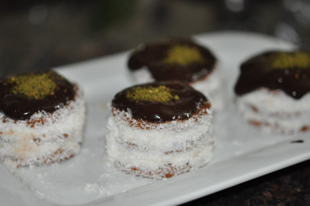 Kenarları düzeltilip Hindistan cevizine bulanır servis tabağına konulur.