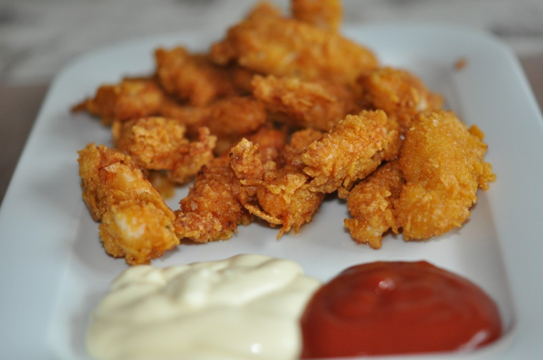 İnce şeritler halinde kesilmiş tavuk göğsü ve kanat önce unlu karışıma daha sonra mısır gevreğine bulanır.