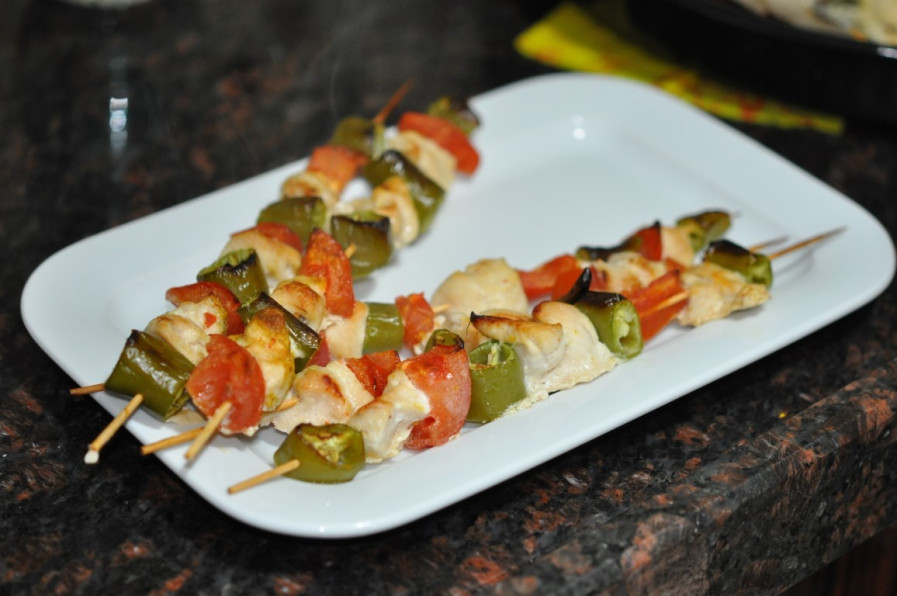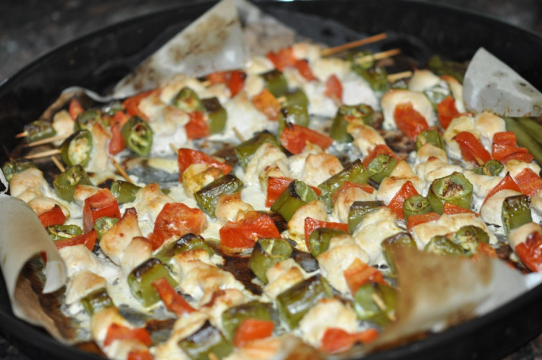 Çöp şişlere tavuk göğsü kuş başı şeklinde doğranan biber, domates sıra ile dizilerek yağlı kağıt serilmiş fırın tepsisine dizilir.