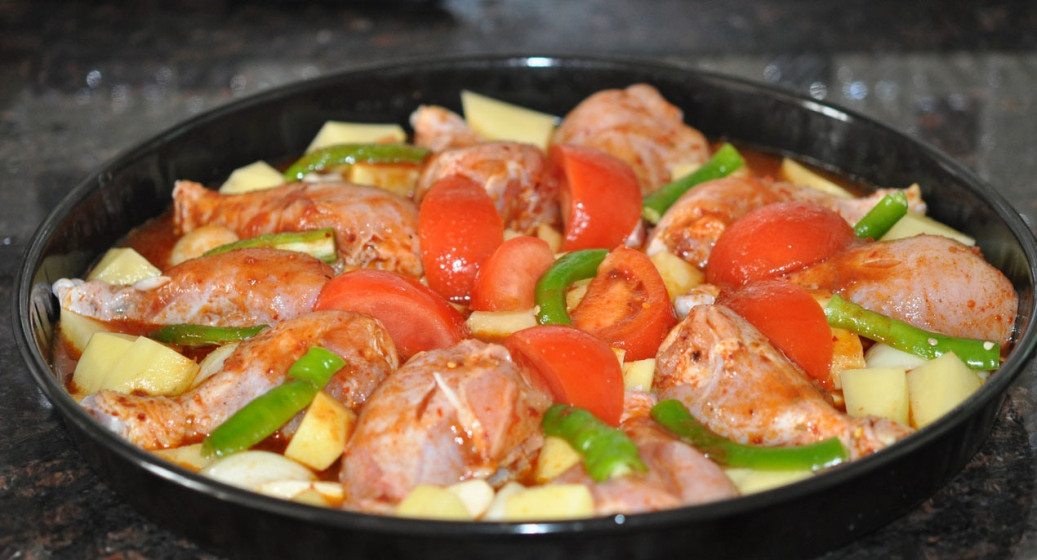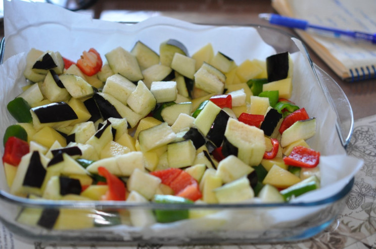 Yağlı kağıt serilmiş bir kabın içerisine patlıcan, patates ve biberler doğranarak üzerine 5-6 yemek kaşığı sıvıyağ ve tuz dökülerek önceden ısıtılmış 200 derecelik fırında patatesler yumuşayana kadar pişirilir.