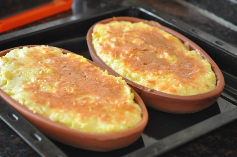 Üzerine kaşar peyniri serpiştirilerek tekrar fırına verilir üzeri hafif kızarana kadar pişirirlir.