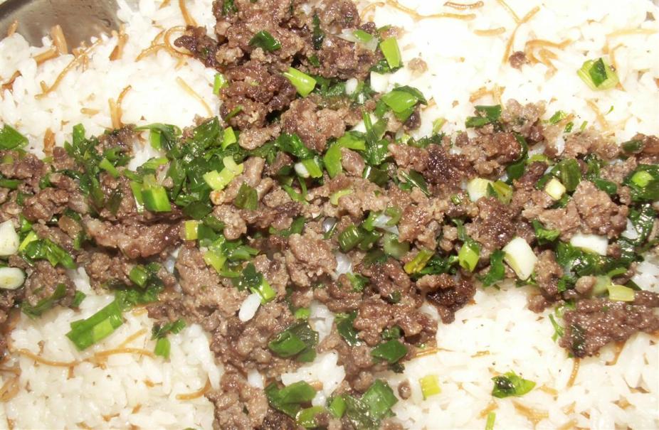 Pilav servis tabağına alınır üzerine istenilen şekilde kıymalı sos gezdirilip sıcak olarak servis edilir