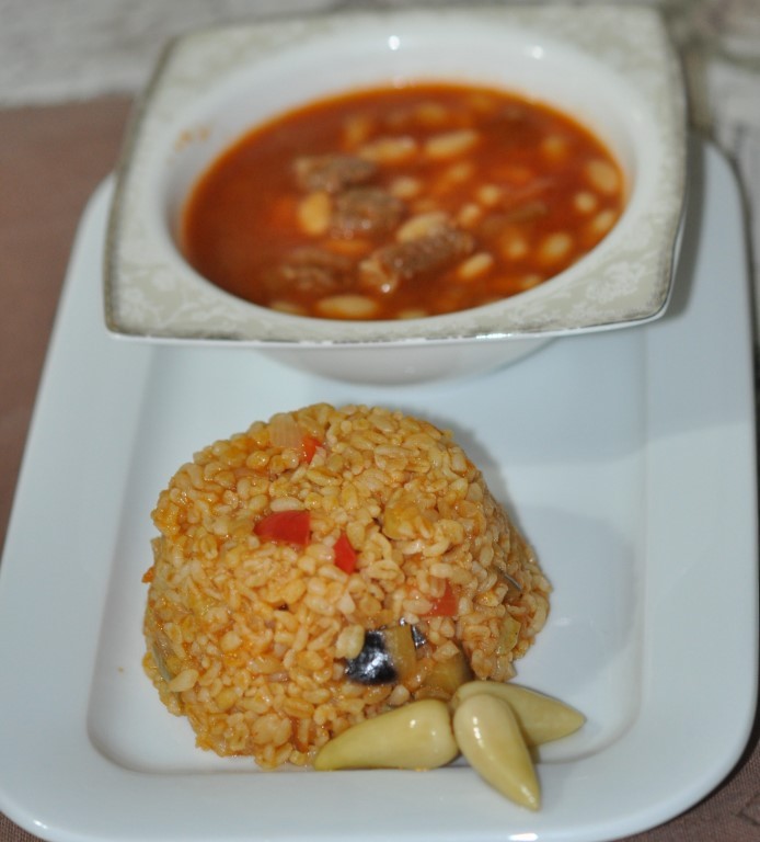 4 su bardağı sıcak su ilave edilir, kısık ateşte suyunu çekene kadar pişirilir.