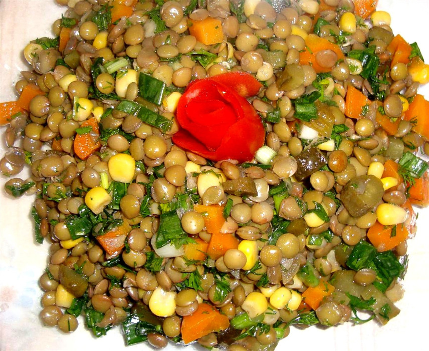 Salatalık turşusu ve havuç küçük küpler halinde doğranıp mercimeğe ilave edilir