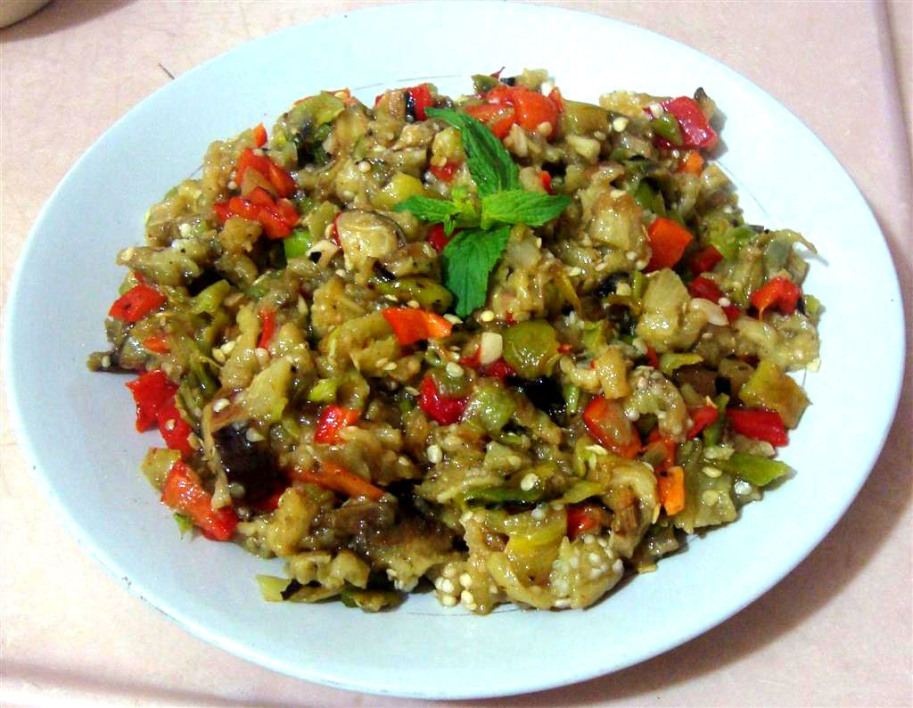 Patlıcanlar kırmızı ve yeşilbiberlerle beraber fırında veya közleme tavasında közlenir. Küçük küçük doğranır.
