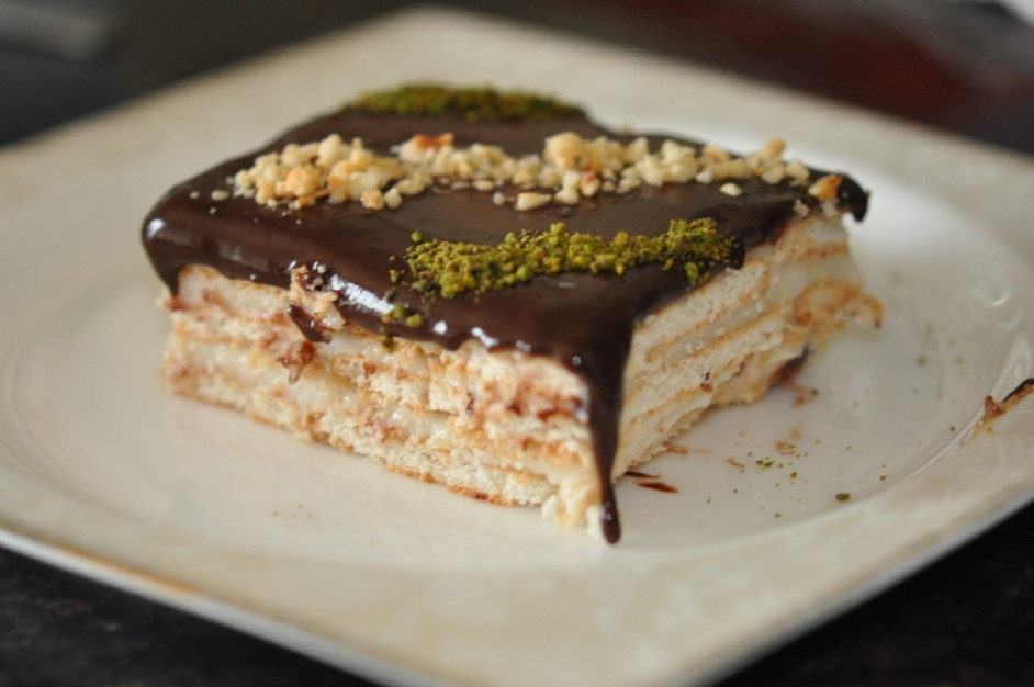 Soğuyan çikolatalı sos bisküvi pastasının üzerine yayılır.